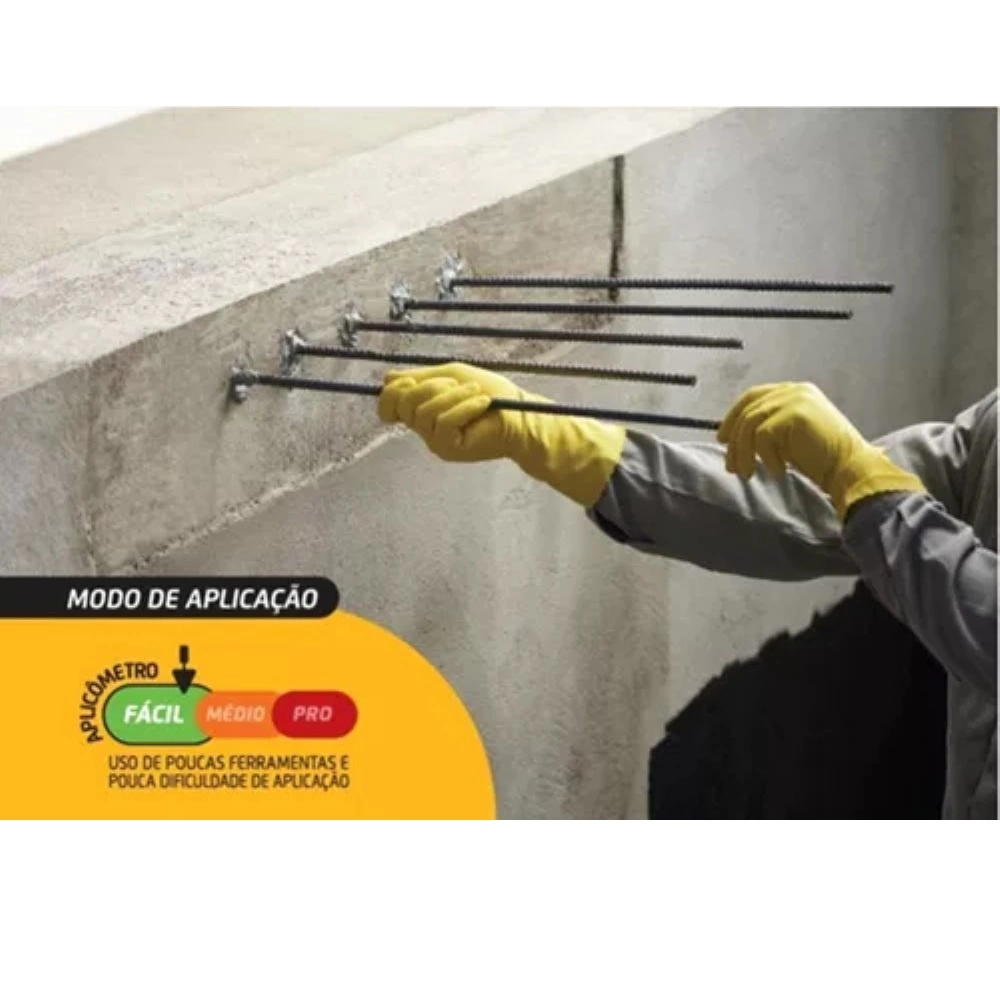 Ancoragens e chumbamentos: varia conforme diâmetros do furo, diâmetro da barra e profundidade de ancoragem, vide fórmulas. Fórmula 1: VF = (Af-Ab) x P Fórmula 2: C = VF x Dp Considerar: VF = Volume do furo (cm³) Af = Área do furo (cm²) Ab = Área da barra (cm²) P = Profundidade de ancoragem (geralmente, considera-se 10 vezes o diâmetro da barra) (cm) C = Consumo aproximado (g) Dp = Densidade do produto (g/cm³).